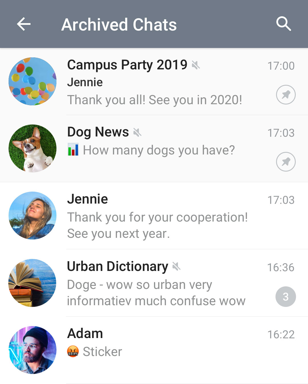Time is money and money buys cat food, so don't waste time and make the most of the bulk actions in your chat list, now also available on Telegram for Android. Long tap on a chat to open the new menu where you can select multiple chats and then pin, mute, archive or delete them, all faster than ever before.