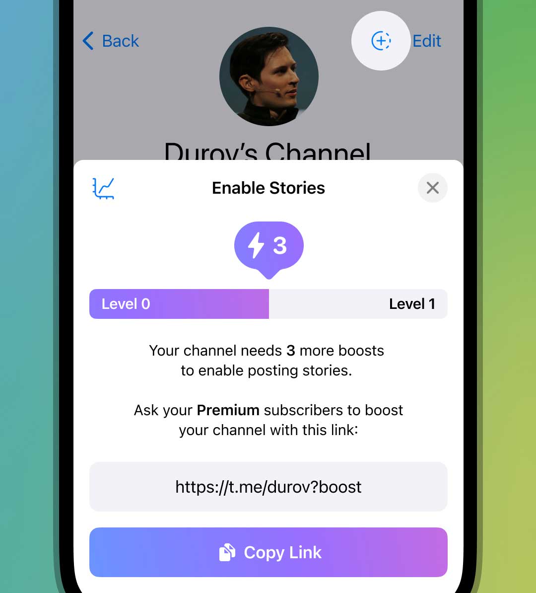 کاربران تلگرام از این پس می‌توانند قابلیت گذاشتن استوری را برای کانال‌های مورد علاقه‌شان فعال کنند. کاربران پرمیوم به همراه اشتراکشان، ۴ حمایت دریافت می‌کنند که می‌توانند آن را به هر کانالی که می‌خواهند، انتقال دهند.