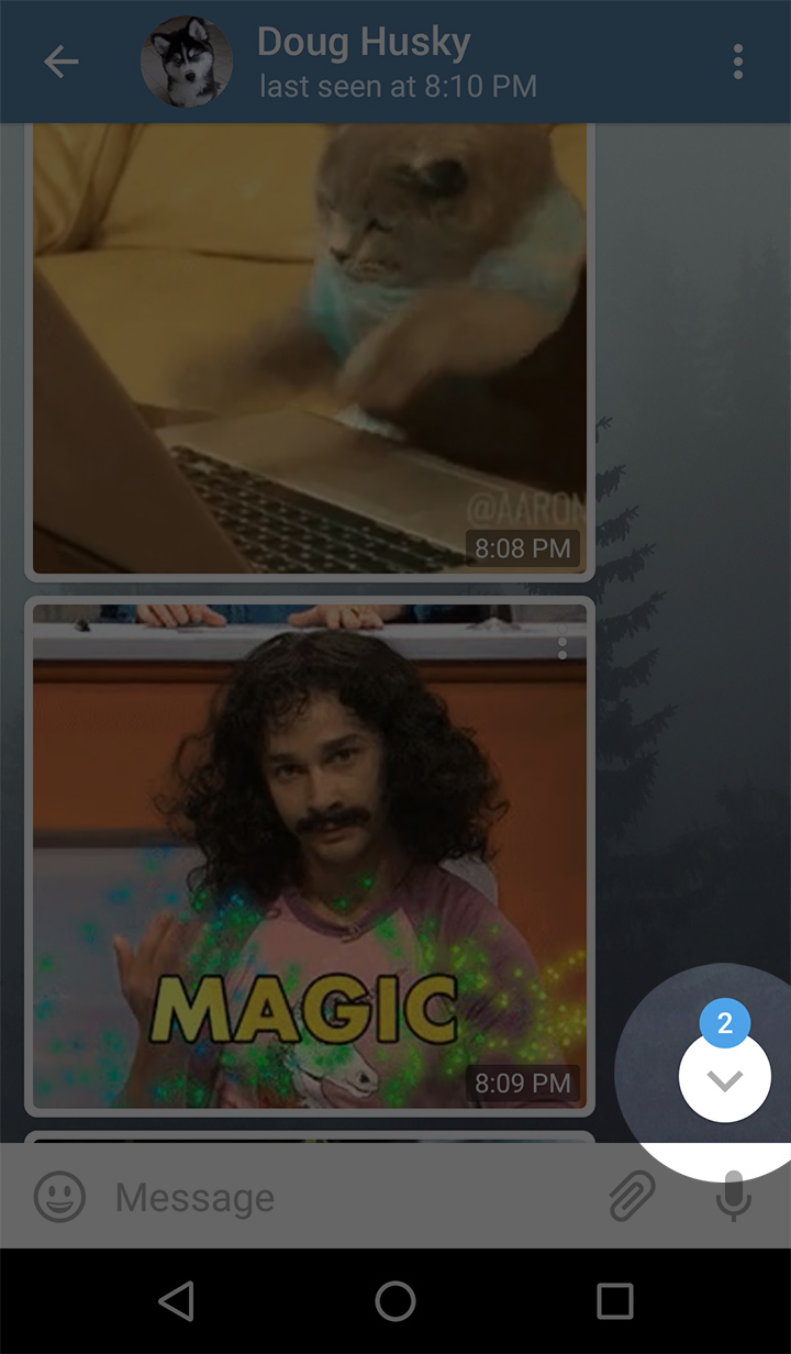 On top of this, Telegram v.3.10 allows you to view the entire set of a group‘s profile pictures instead of just the latest one. The beautiful ’Scroll to bottom' button with an unread messages counter has made it to Android and Telegram Desktop.