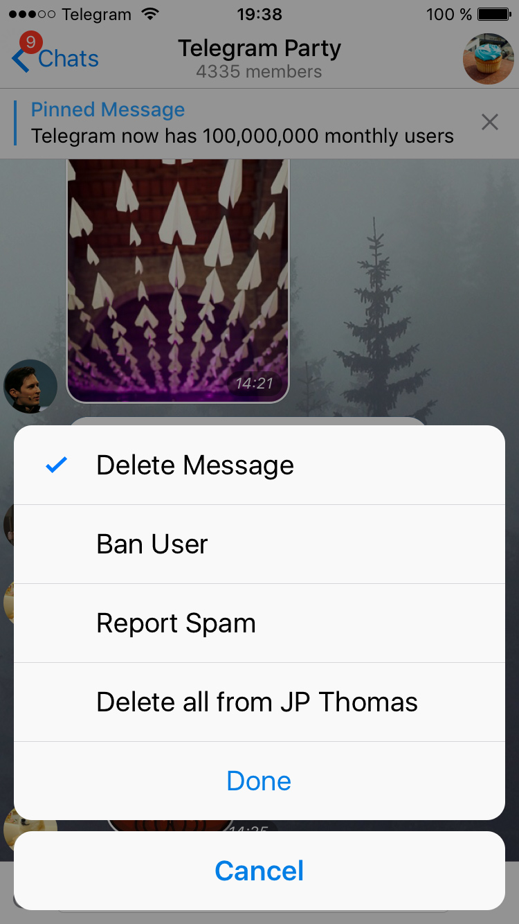 We know what you’re thinking. What about spammers? To prevent potential spam issues, we're introducing powerful moderation tools for group admins. From now on, they can quickly delete all messages from a specific member, block and report them.
